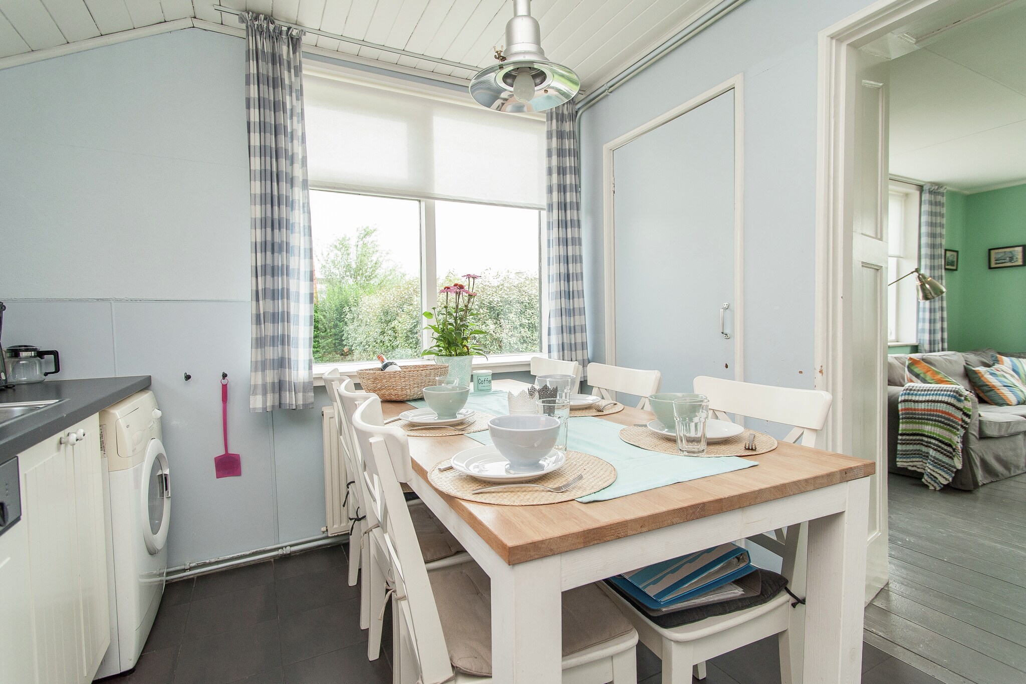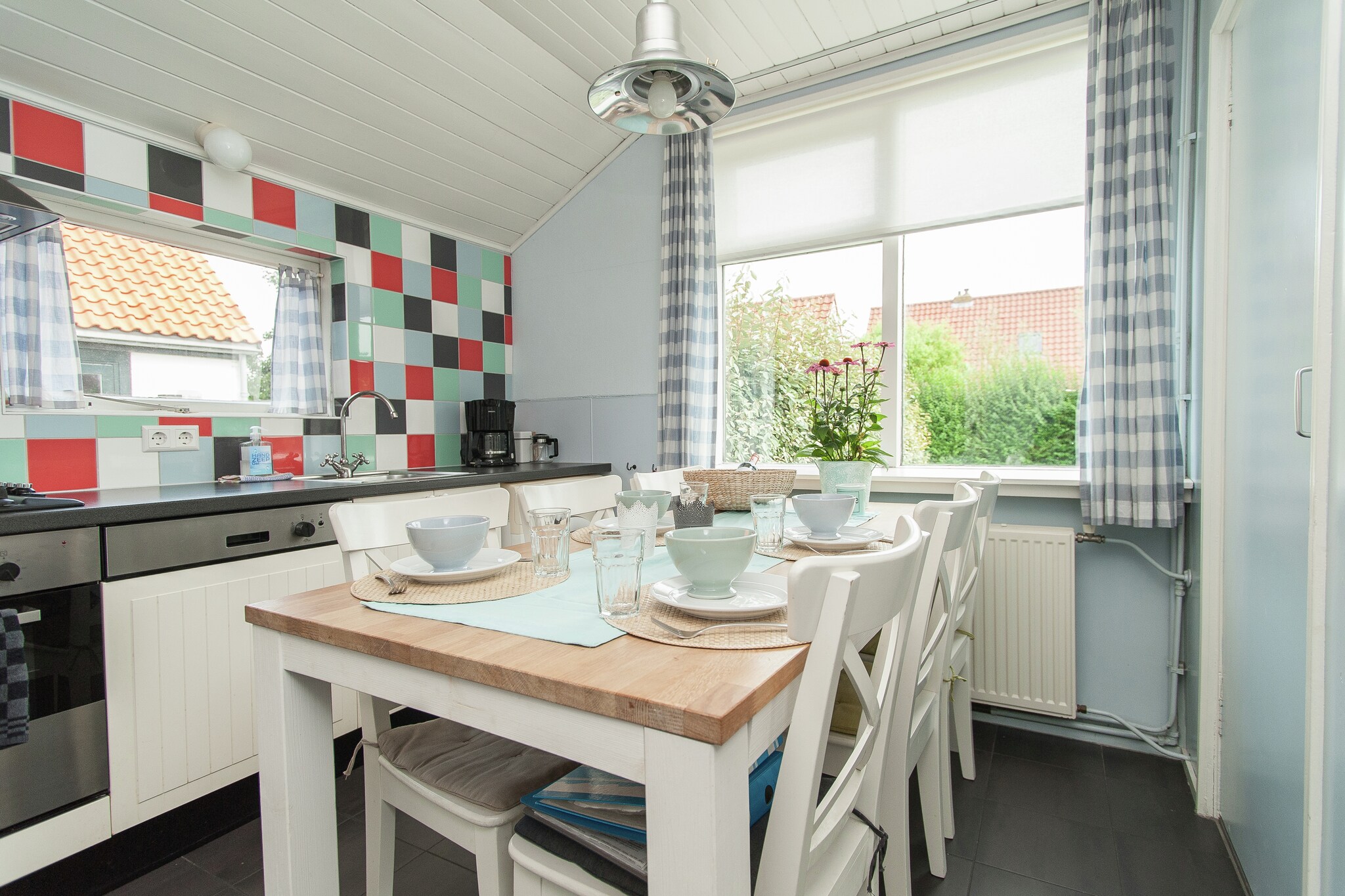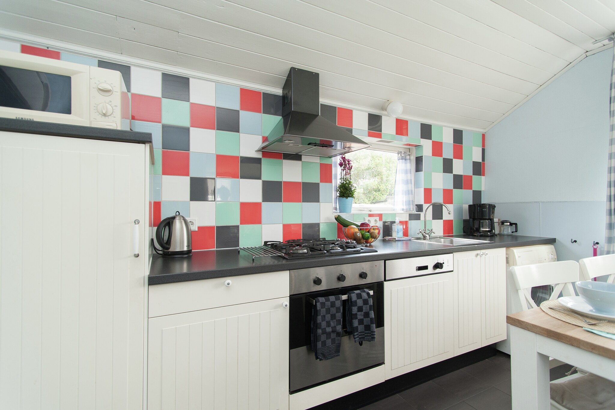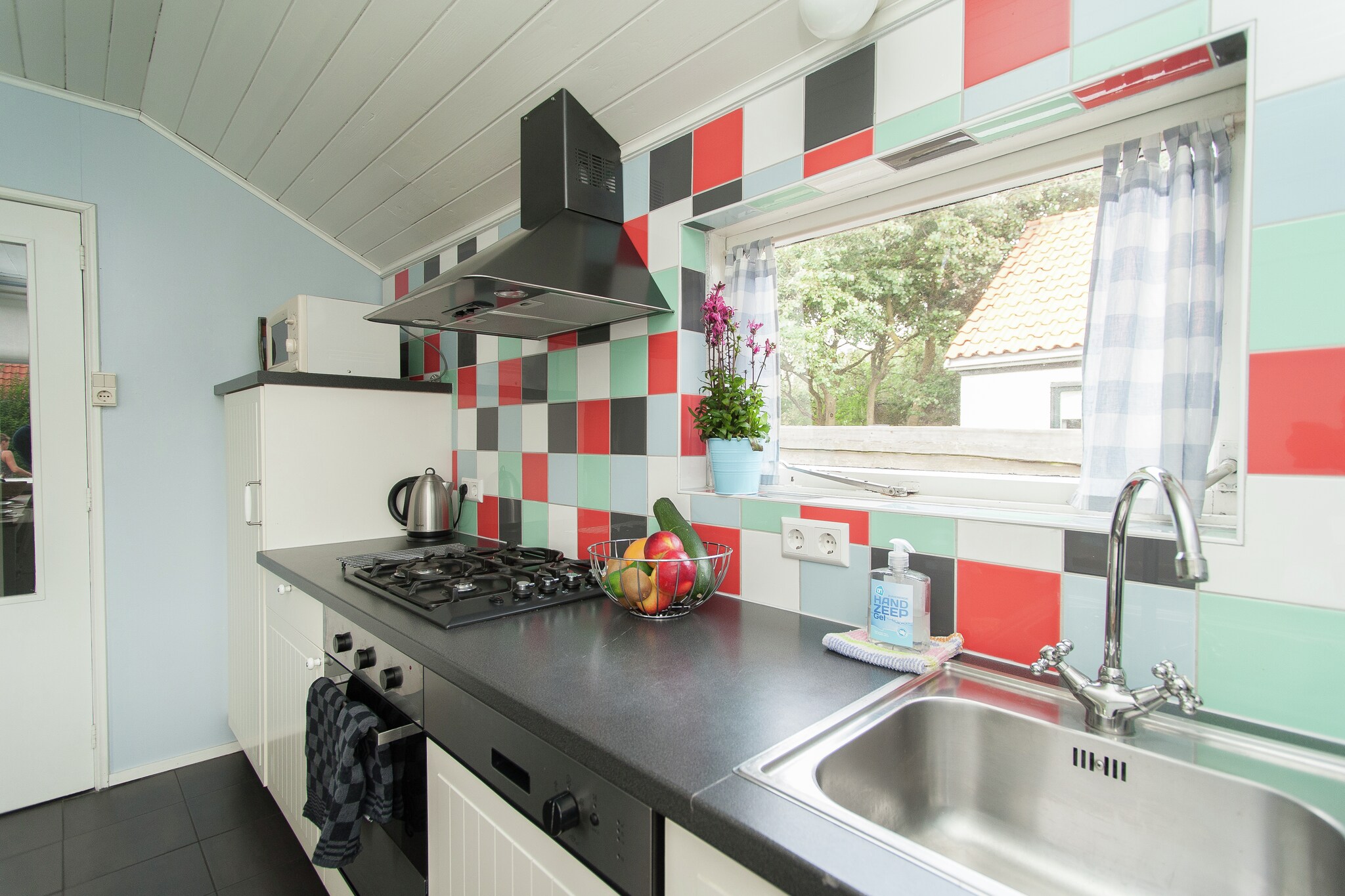 Het vakantiehuis is gezellig ingericht en de muren zijn voorzien van frisse, vrolijke kleuren. De knusse woonkeuken en de badkamer zijn voorzien van kleurrijke tegeltjes. Op de benedenverdieping treft u ook een slaapkamer aan. Via een (redelijk steile) trap bereikt u de etage, waar zich nog twee slaapkamers bevinden.
