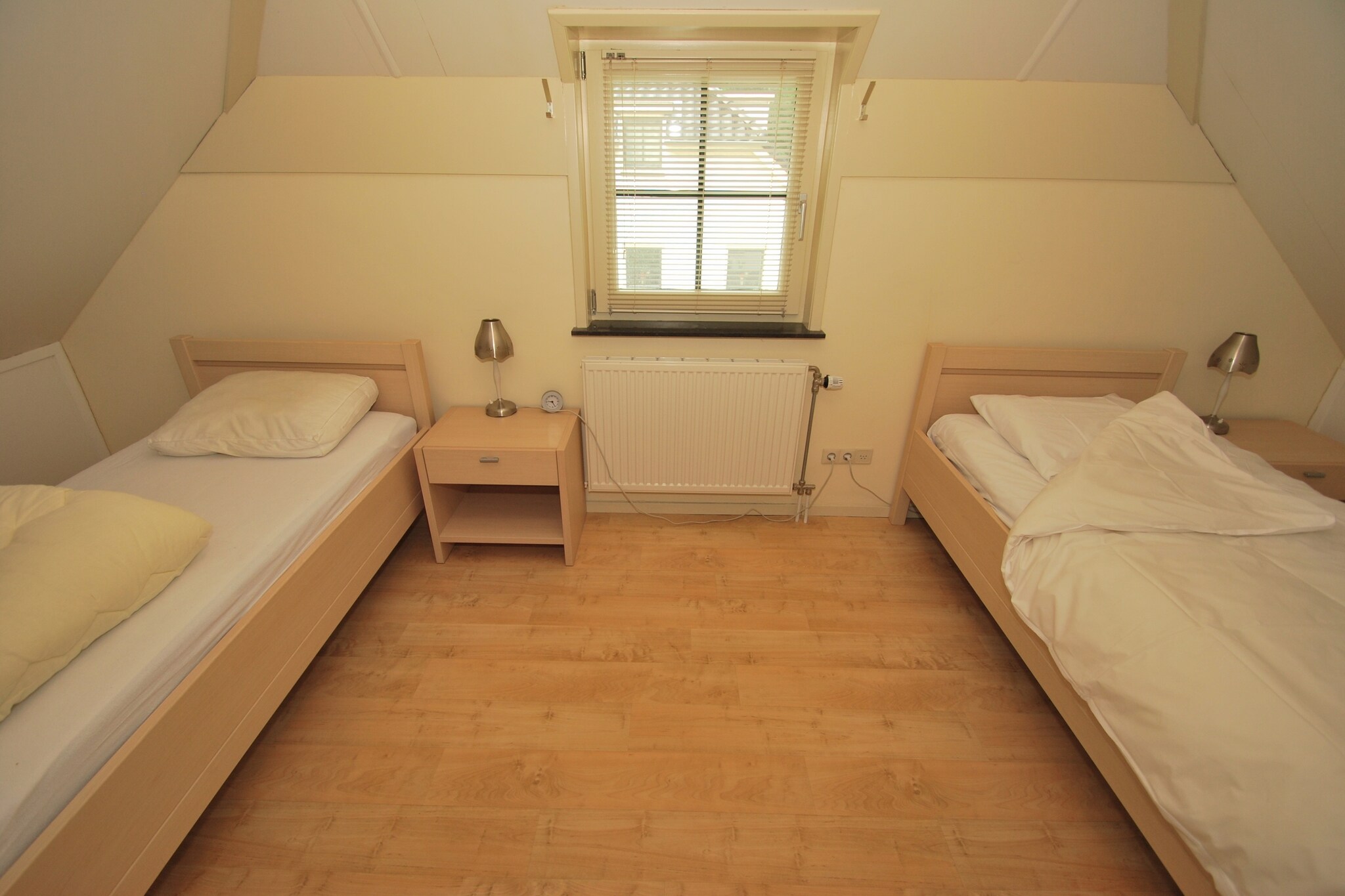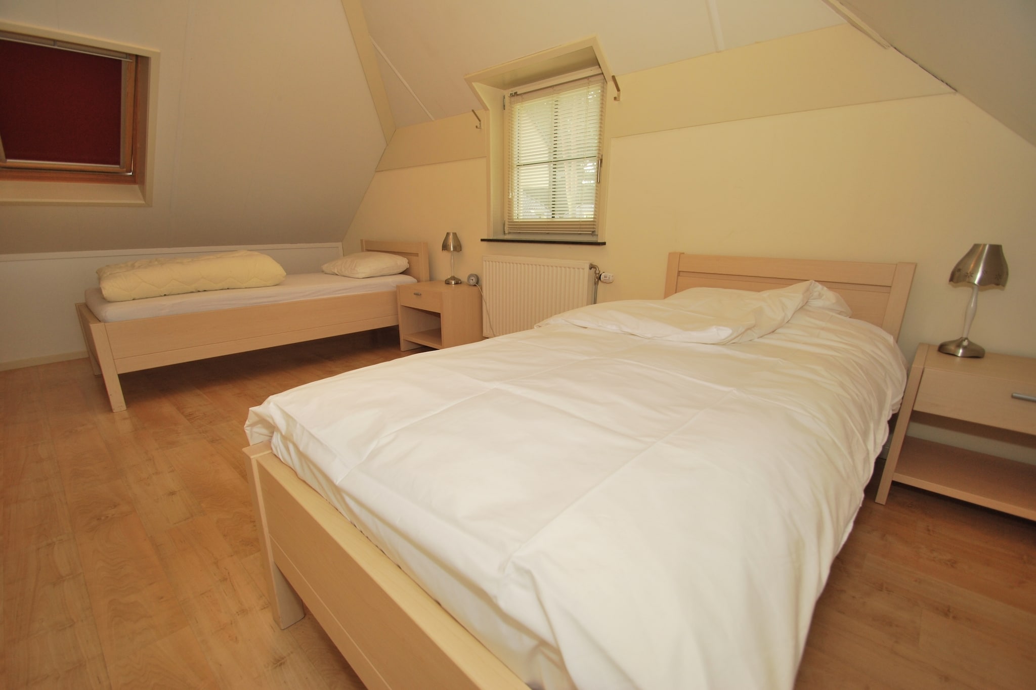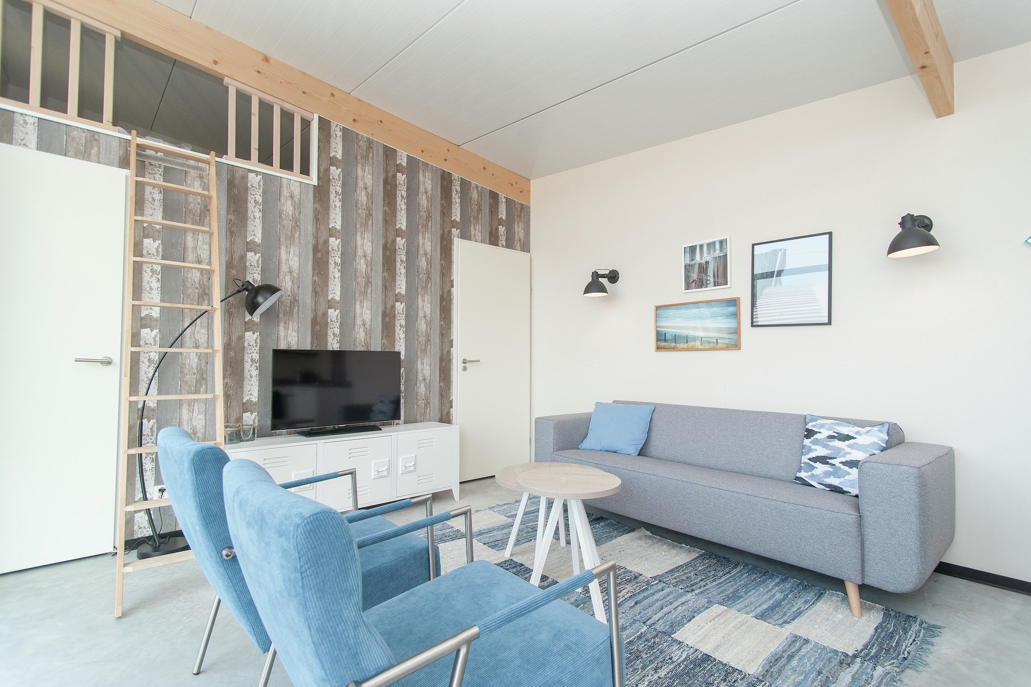 De 4-pers. Sea Lodge Bloemendaal voor maximaal twee volwassenen en twee kinderen (NL-6765-01) met één slaapkamer en een ruime slaapvide (geen stahoogte, te bereiken via steile trap in de woonkamer).
