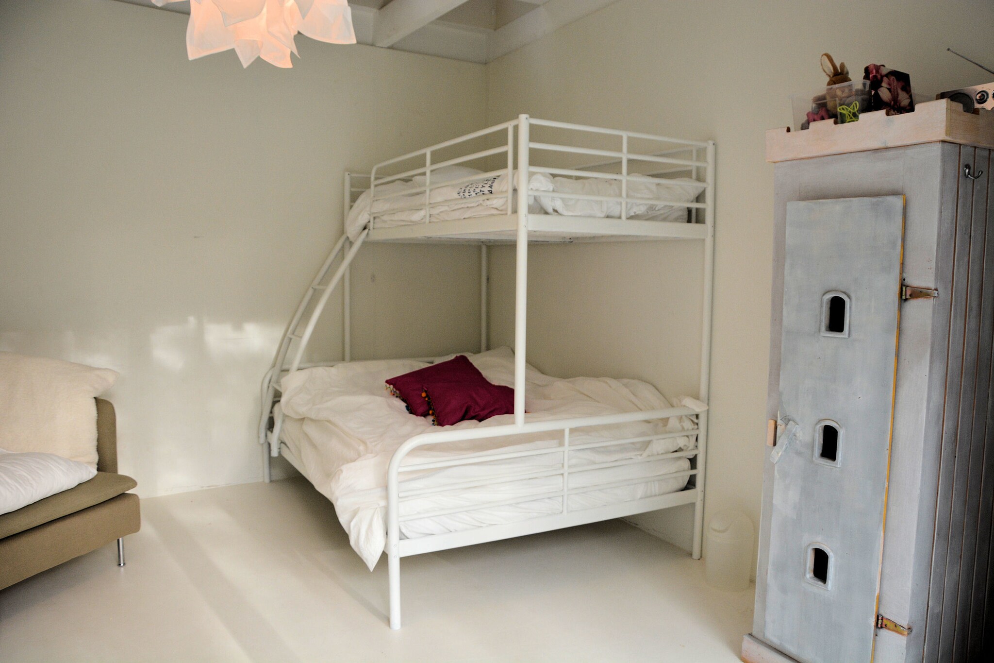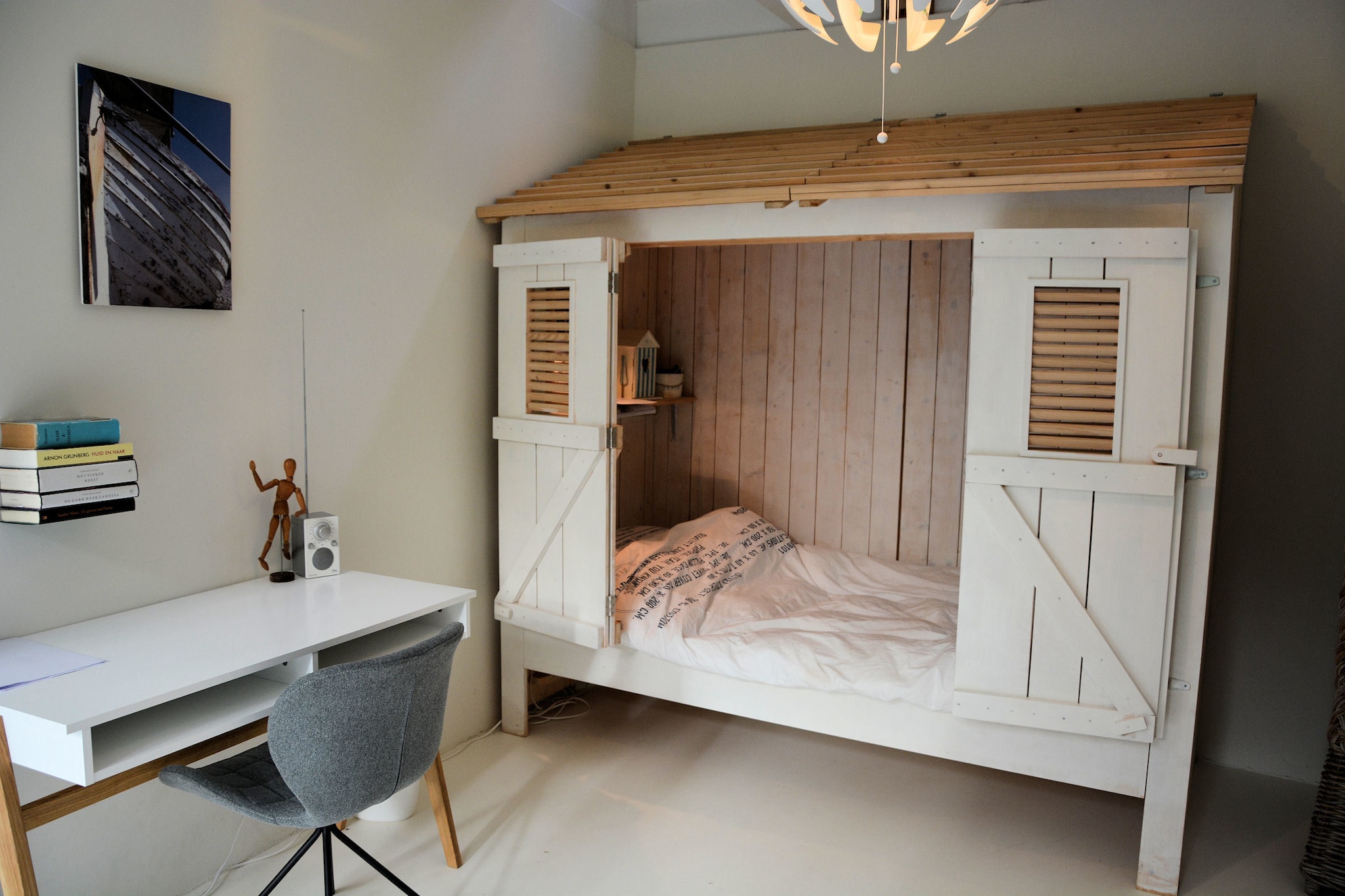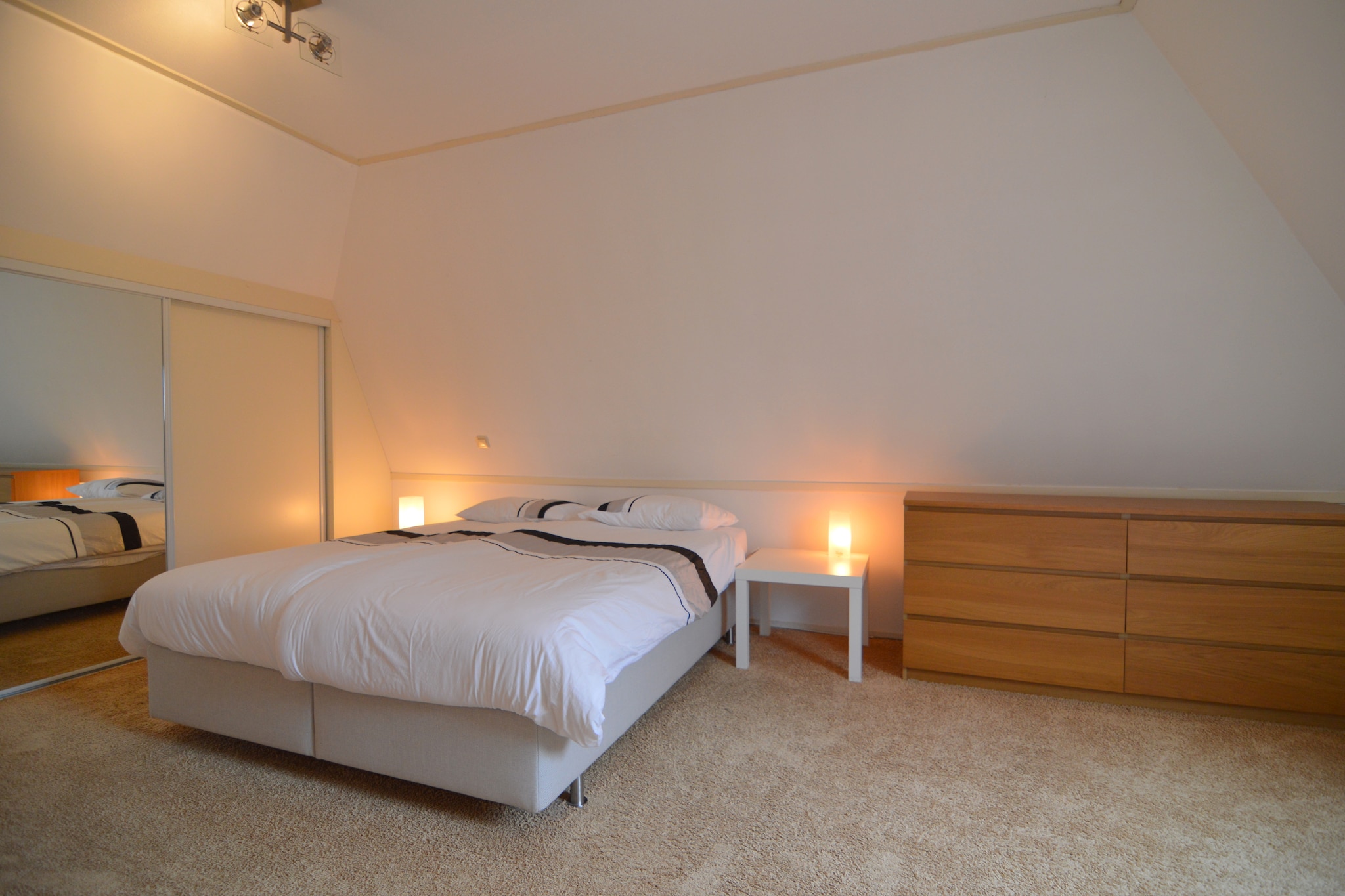 De 4-pers. Sea Lodge Bloemendaal voor maximaal twee volwassenen en twee kinderen (NL-6765-01) met één slaapkamer en een ruime slaapvide (geen stahoogte, te bereiken via steile trap in de woonkamer).