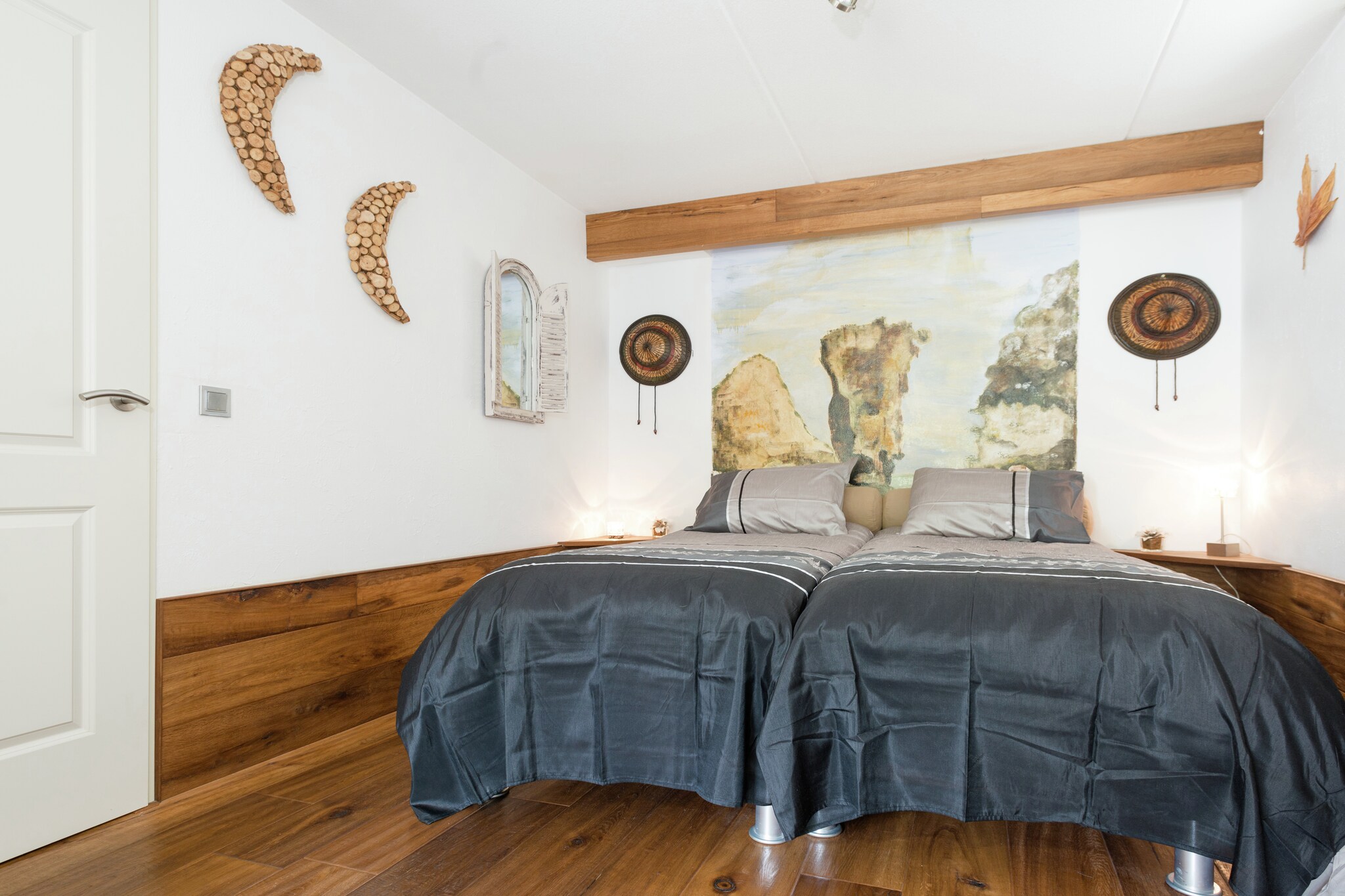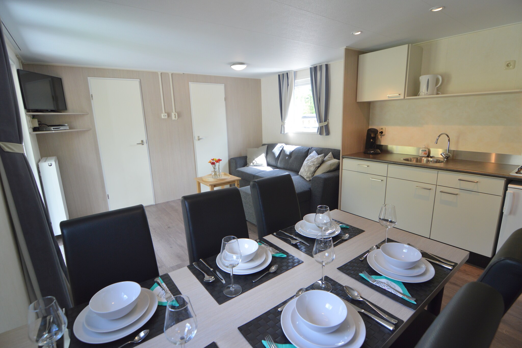 De 6-pers. Sea Lodge Family voor maximaal vier volwassenen en twee kinderen (NL-6767-01) met twee slaapkamers en een ruime slaapvide (geen stahoogte, te bereiken via steile trap in de woonkamer) en één badkamer met douche en een apart toilet.